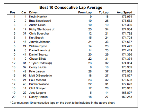 - Kurt Busch is top-five in five lap, 10-lap, and 15-lap averages while Kevin Harvick is tops in all of those metrics at final practice.