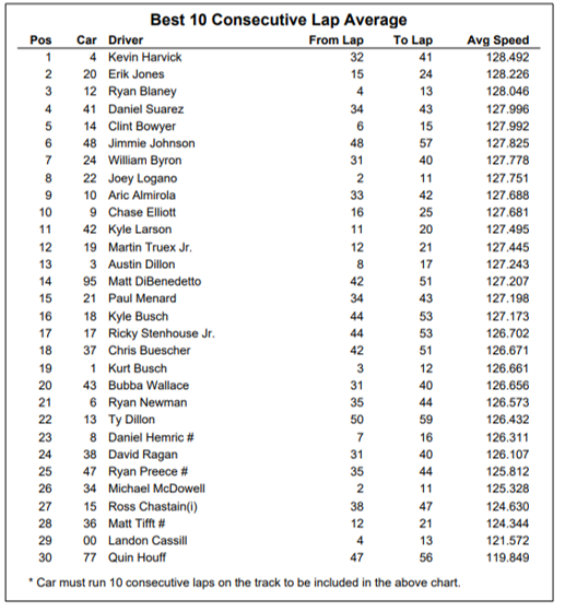 - Kevin Harvick is leading most of the consecutive laps categories in this session at 10, 20, and 30 laps.