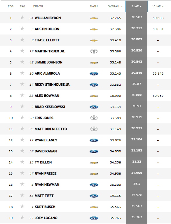 - William Byron had the fastest lap for most of the session until Bowyer topped him very late in the session. He wants to work on drivability in some areas of the track.