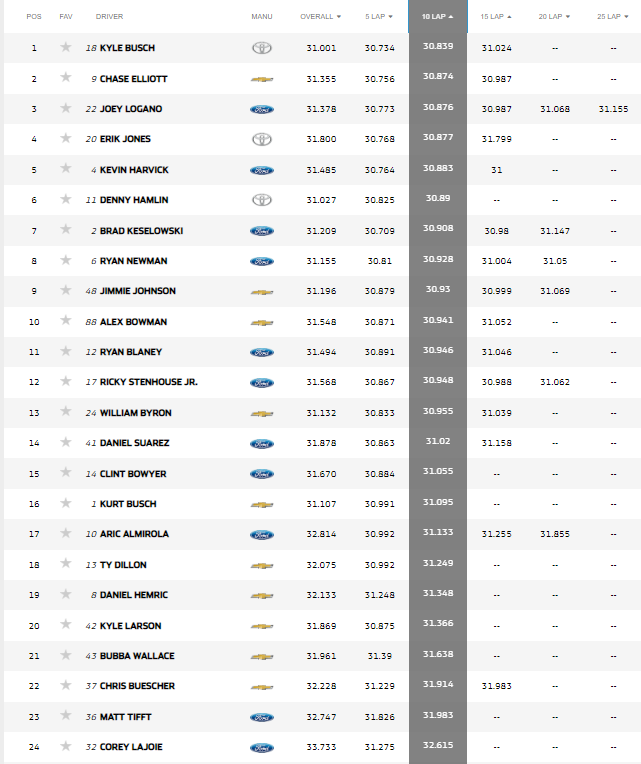 - Denny Hamlin said he’s really tight in turns 3 & 4 and said he’s still having problems with the front left tire that won’t give him the drive off that he wants it to.