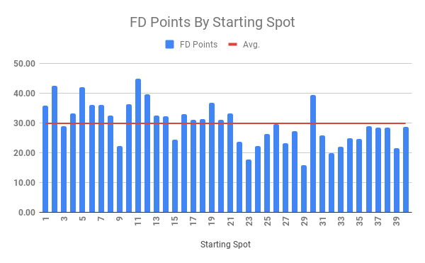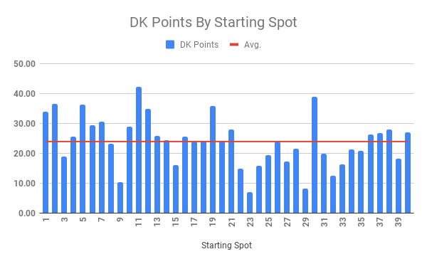 These charts show the average points scored by starting spot over the last five road races regardless of who started in those spots. Keep in mind that the last five road races have been run on Roval-style tracks and not true road races and so the points will be a bit skewed. They are meant as a strategy tool and not hard and fast rules about who will do what in those starting spots, once we know them.