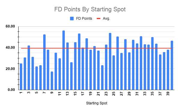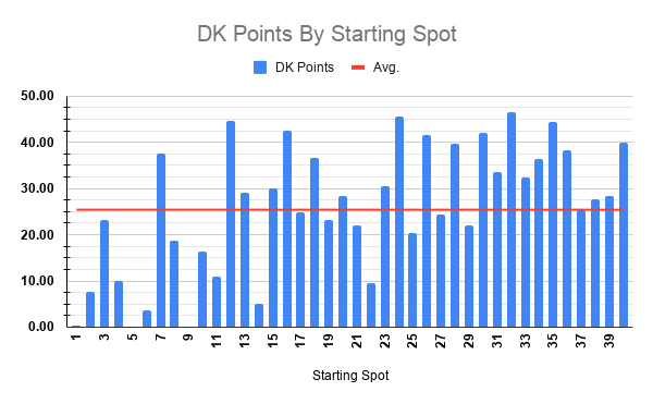The trends table above indicates we shouldn’t see any one particular driver heavily dominate this race. 64% of the top 10 finishers in the last five Dega races have started outside the top 12. And only half the laps led come from drivers starting inside the top 10. Yes, it’s still likely a driver from an elite team wins this race. However, we’re going to see some surprise drivers finish very well and you can leave so much money on the table when constructing lineups as we’ll detail below…