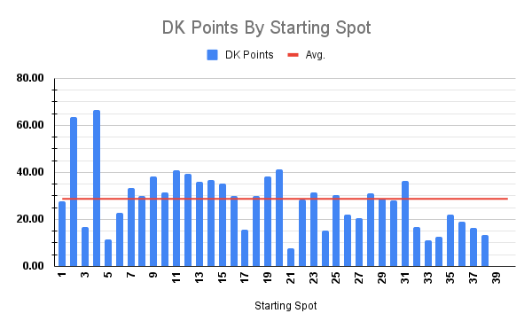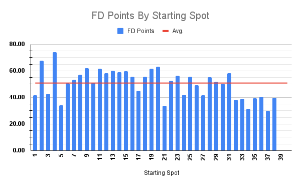 The starting spot charts are certainly interesting and I hope to shed some light on them. The P2 and P4 starting spots stand out. The P4 starting spot has won two of the last five races, in addition to finishing third or better in four of the last five races. The P2 starting spot has finished second or better in three of the last five New Hampshire races. So with that kind of track position, we obviously get win equity and dominator potential. Martin Truex Jr. won this race in 2023 starting from P2 and he led 254 laps with 88 fastest laps for a massive score of 149.1 points on DraftKings. Last year, Christopher Bell won this race from P4 with 149 laps led and 43 fastest laps for a score of 104.6 points on DraftKings.