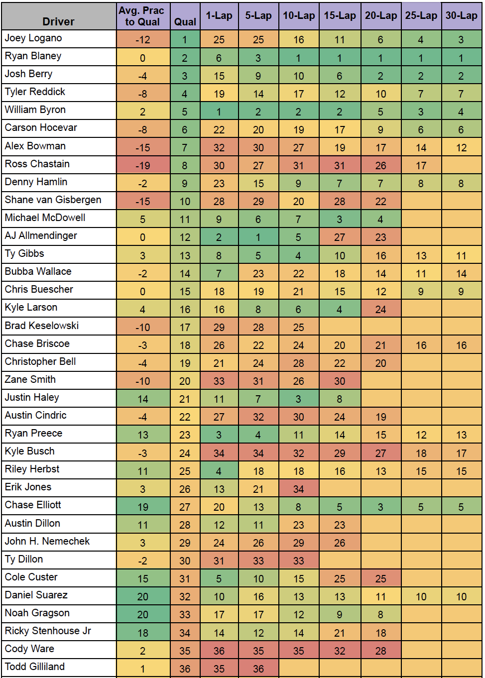 Byron qualified P5 and may not draw nearly as much ownership as Blaney or Logano, who start on the front row. But he still has great track history rolling off P5. If you look at the practice-to-qualifying table, you’ll see that Byron was top five in basically all the short-and-long-run metrics. He was really only behind Blaney in terms of long run speed in the second practice group.