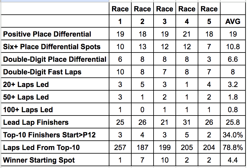 Now we should at least acknowledge a big reason for this is that this five-race sample size includes two wins from Kyle Larson where he started P2, led 100+ laps in each race, and returned over 120 dominator points combined between both races.