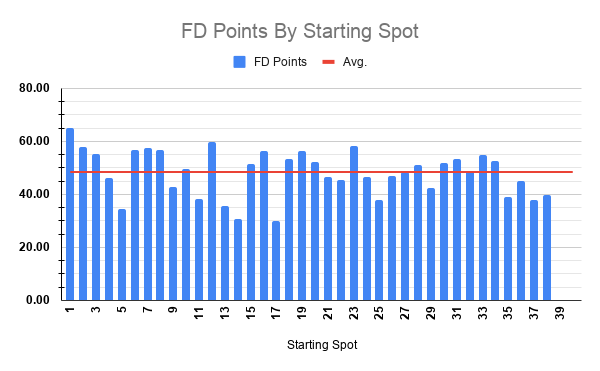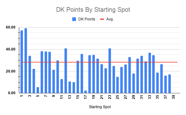 Overall, the trends above aren’t too shocking for a high-speed intermediate track. We will have movers, there will likely be some big dominators, and we should see some chaos as well given the tire wear narrative.