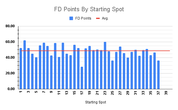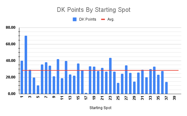 The P2 starting spot obviously sticks out. The charts above are based on the last five Vegas races and three of those winners started P2. In the Spring of 2024, Kyle Larson started P2 and won with over 64 dominator points. Two years ago, again Kyle Larson started P2 and won with just under 64 dominator points. In the Spring of 2023, William Byron won after starting P2 with over 70 dominator points.