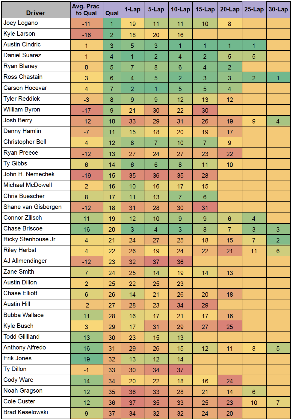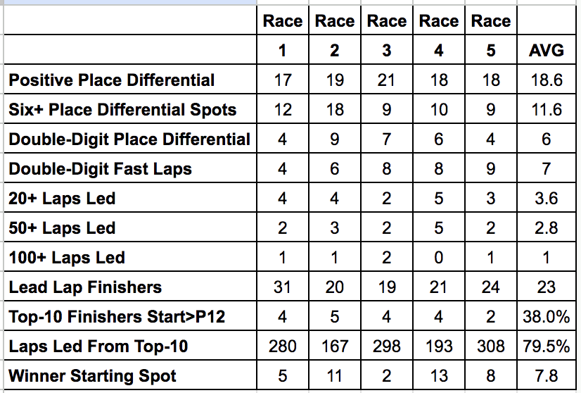 Based on the trends table above, we should expect most of the win equity come from drivers starting in the first six or seven rows. While passing has been difficult on the shorter tracks, we can find comfort seeing that Phoenix has averaged 11.6 drivers per race that can gain 6+ spots of position differential over the last five races. And on top of that, 62% of the drivers to finish in the top 10 have actually started outside the top 12.