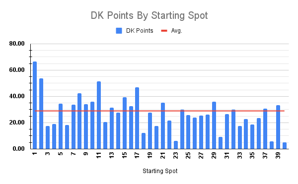 Based on the table above, the front row will be popular. A driver starting on the front row has made the optimal lineup in all eight NextGen races at Phoenix Raceway and based on the averages in the tables above you can understand why. Clean air is king and the front row has easy access to getting out front and collecting laps led and fastest laps. I’ll be making 20 lineups for Sunday’s race and I imagine I’ll play at least one driver from the front row in about 70% of my lineups.