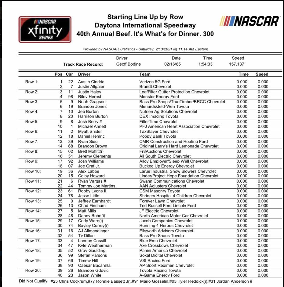 The written number to the right of every driver’s name is where they would start. If they’re outside the Top 40, they wouldn’t run. If they have a ‘N’ next to their name they won’t run without qualifying. So obviously for the sake of fair competition, we’re hoping they run qualifying. If not, we’ll run into a lot of chalk that we may want to avoid, but we’ll cross that bridge with updates through the day when we get to it.