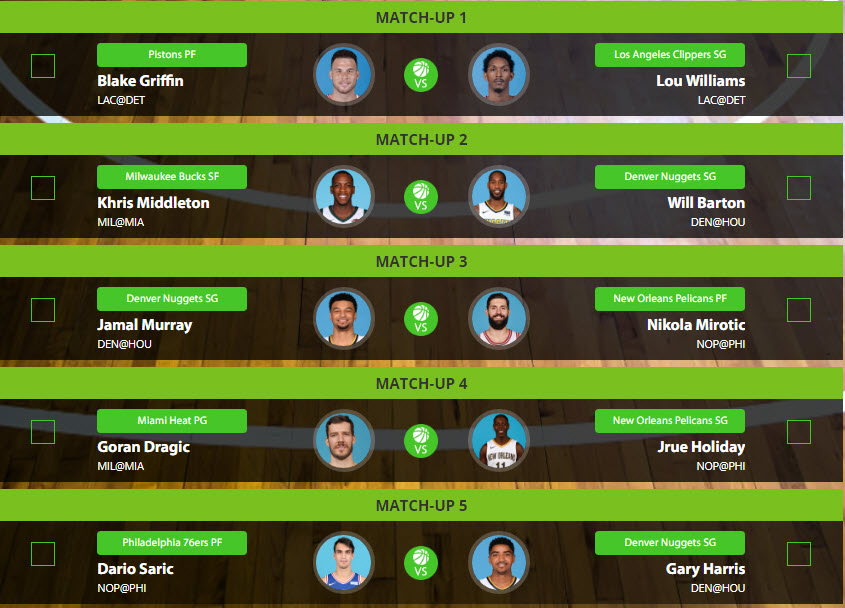 Now that we turn our full attention to the NBA, I have chosen two of the four NBA slates for my picks. These picks are the ones I am actually playing in my own entries. Each player is listed along with his opponent, with my pick highlighted.