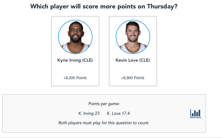 Question one asks us who will score more points between Kyrie Irving and Kevin Love. Even though Boom gives us each players points per game this postseason – which is advantage Irving – lets