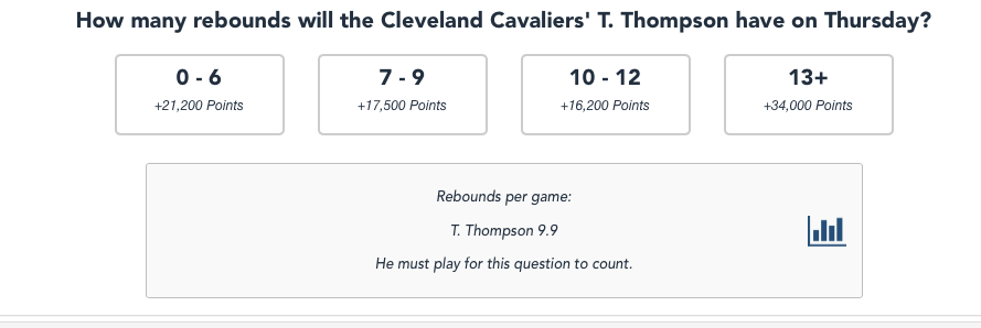 The second question is also a question about who will score the most points and it includes Avery Bradley, Jae Crowder, Al Horford and Tristan Thompson. Thompson is definitely the underdog and the least skilled offensively but like I mentioned with Love, the Celtics have no interior defense and he could have a ton of second chance opportunities on the offensive glass. The three Celtics are really a toss up as they’ve played much more team oriented basketball since Isaiah Thomas went down with injury. Bradley is the most individually talented scorer, but both Horford and Crowder can get hot and fill up a box score.