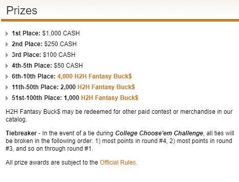 The focus for most of this article has been Head2Head’s College Choose’em Challenge, and for good reason. It is new, exciting, fun and challenging. It puts a new wrinkle on traditional NCAA Tournament games, and as such, playing the game successfully requires a lot of thought and analysis. Of course, Head2Head has a lot more to offer than just the College Choose’em Challenge. They also do the traditional bracket challenge better than anyone, with their March Mania Contest. You can enter up to four teams for only $10 each. That means you can enter multiple brackets to give yourself the best chance at the $1000 first prize, or if you only create one bracket, you can enter it in up to four different leagues.