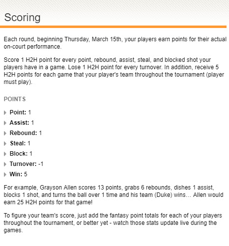 College Choose’em Challenge features 12 groups of players, with eight players in each group. You choose one player from each group to fill out your 12-team roster. Those players then earn fantasy points for as long as their teams remain in the NCAA tournament, with five bonus points each time their team wins a game. Your team needs to balance picking high-scoring players with picking players who advance deep into the tournament. That one twist adds several layers of strategy to the sometimes mundane activity of filling out your NCAA Tournament bracket.
