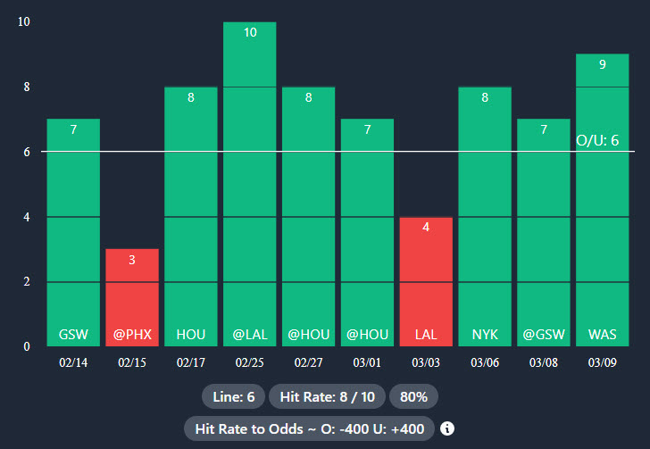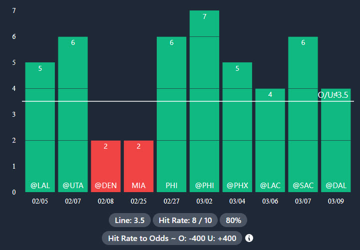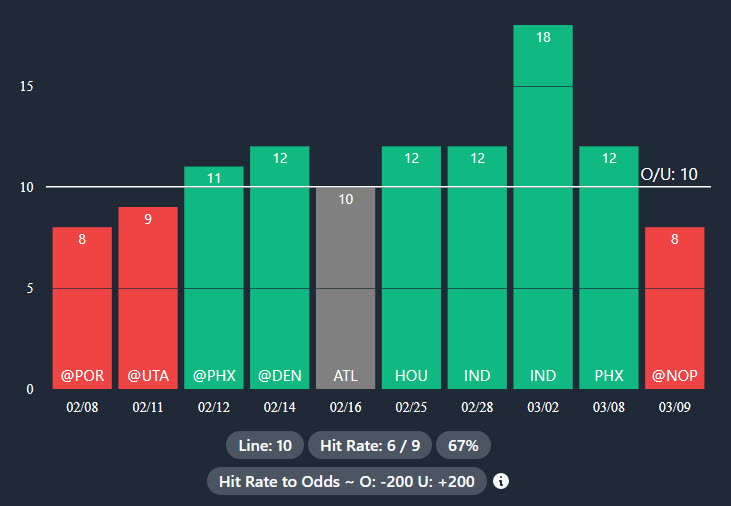 Another familiar name finds its way back into today's featured article as Mann continues to be a rebounding machine. Over the last 10 games, he is averaging 7.1 rebounds per game and he has hit the over on today's 6.0 total in seven of the last eight and eight of the last 10 games. With Robert Covington out of the lineup again tonight Mann will have some less rebound competition on the floor as Covington himself tends to crash the glass. The Hawks have struggled a bit when it comes to shooting, ranking just 23rd in team shooting percentage over the past three games. Those missed shots mean rebound opportunities for Mann tonight.