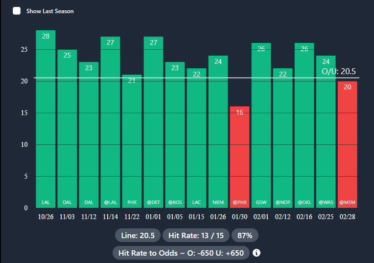 We played this prop the other night and got a late stat correction to put us over in a really tough matchup against the Grizzlies. Fortunately, tonight Vassell will face the much easier Kings lineup. In games where Vassell is playing at least 29 minutes, which is what he is averaging since the trade deadline, he has hit the over on this mark in 13-of-15 games this season. In 25 minutes against the Kings earlier this season, we also saw Vassell hit the over on this mark, finishing with a total of 21 PRA. This game has a slate-high 243 games total, feeling confident here.