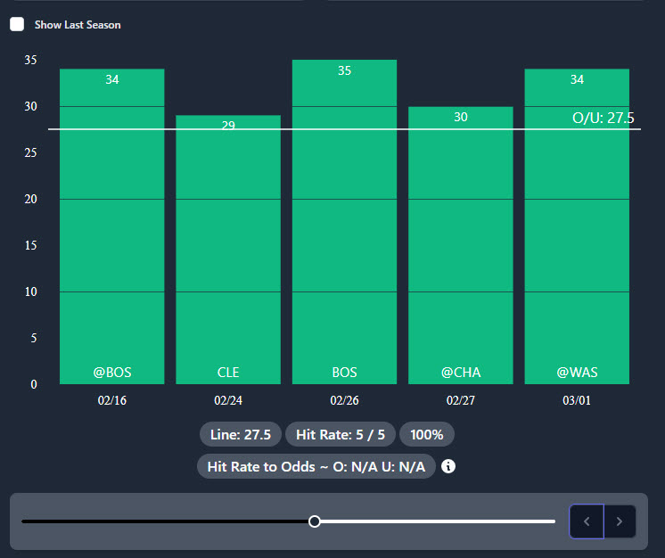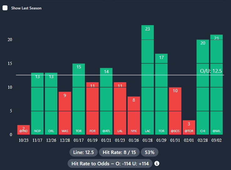 This line actually dropped from 28.5 to 27.5 from the time I started my research for today's slate but it hasn't deterred me at all from wanting to play it. As you can see from the chart below, Cade has hit the over on tonight's prop total in five straight games. He is really starting to play well with the rest of his teammates with Jerami Grant and Saddiq Bey really thriving alongside. The Raptors are on a brutal stretch of games right now and will again be without Fred VanVleet and OG Anunoby tonight.