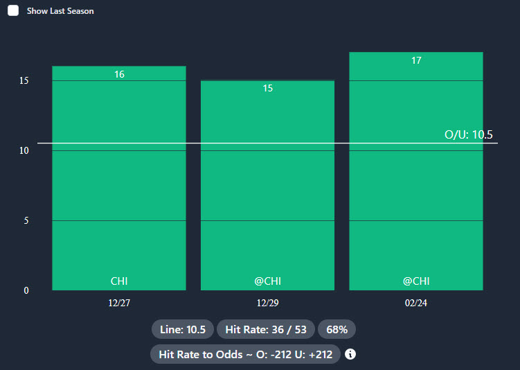 This line here is certainly another one that has me just slightly perplexed given Capela's dominance in this matchup this season. In three games against the Bulls Capela has pulled down rebound totals of 17, 15, and 16 so to see just 10.5 rebounds tonight feels like the easy pick. We saw Capela pull down 11 rebounds against the Celtics in Atlanta's last game and he had nine rebounds in just 18 minutes against the Raptors. In games where he has played at least 25 minutes this season, Capela has hit the over on this total in 81% of the games.