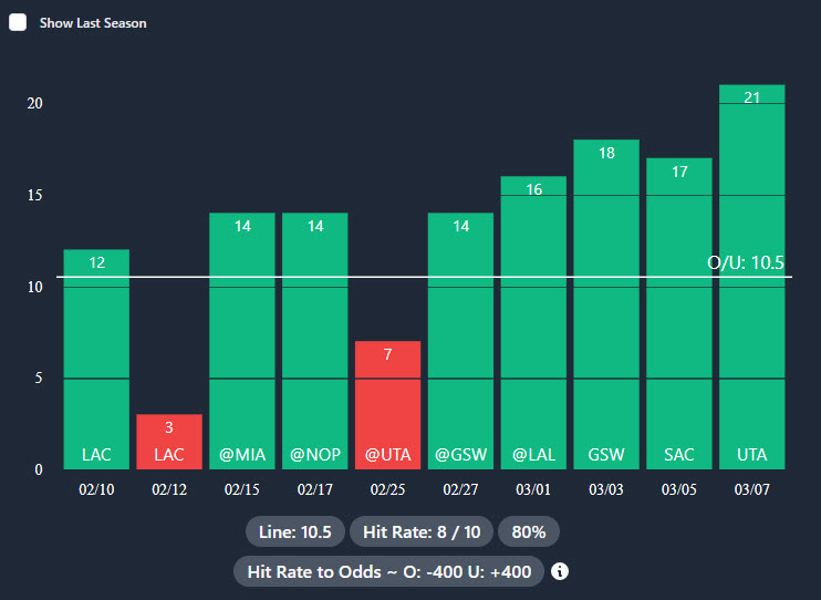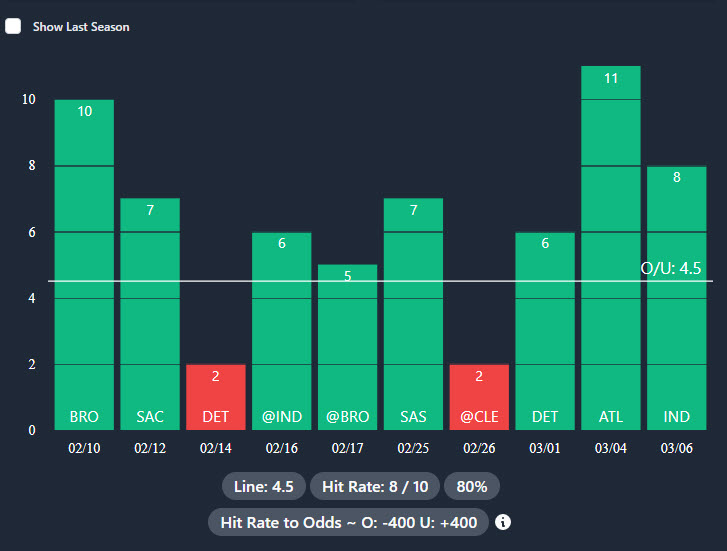 While we've often focused on the rebound and point totals for Kuzma it has been his increased assist numbers that have been jumping off the page for me over the past week or so. That said, tonight we go after it with his assist total sitting at just 4.5 in his matchup against the Clippers. Kuzma is averaging 6.4 assists per game over the last 10 contests while going over the 4.5 assist threshold in eight of 10 contests. The addition of Kristaps Porzingis to the Wizards rotation adds another scorer for Kuzma to pass the ball to.