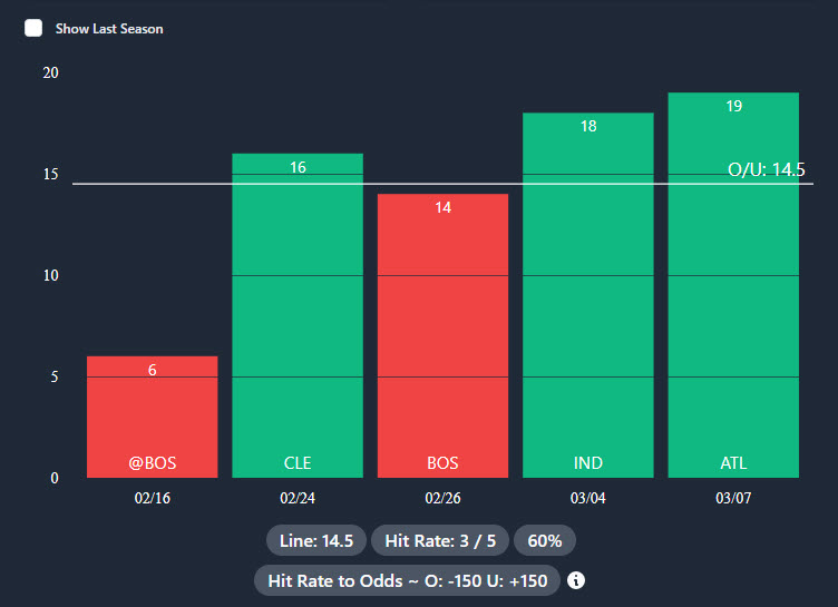 This one may be a bit riskier than the others given all the scoring options in the Pistons lineup right now with Cade Cunningham, Saddiq Bey, and Jerami Grant all playing at their ceiling but with Isaiah Stewart out of the lineup, we saw Bagley play 36 minutes the other night against Atlanta. When healthy we've seen Bagley be a high upside offensive threat and tonight's matchup against the Bulls is a pretty good one even if Nikola Vucevic is active. Bagley has hit the over on this total in three of the last four games and when on the floor over the past two weeks he has a 23.8% usage rate.