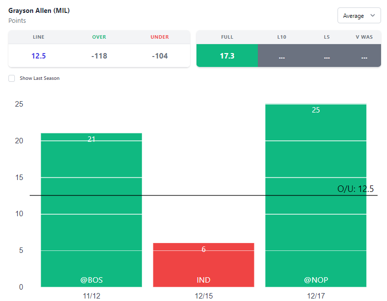 There have only been three instances in which both Antetokounmpo and Middleton have been out in the same game that Allen’s played in and he’s hit the over twice, both times scoring 20+ points. He has scored double-figures in four of his last six games overall and they were being played with both of them in almost every game.