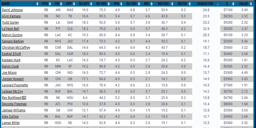 At running backs, I am taking the extreme value in Jordan Howard . I then pay up to get the extreme talent in Alvin Kamara and David Johnson and take the matchup versus the New York Giants for Leonard Fournette who is another player who starts strong.