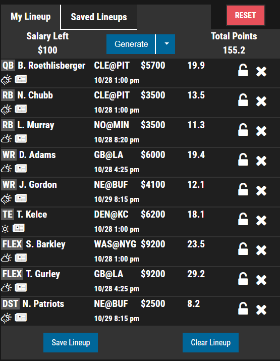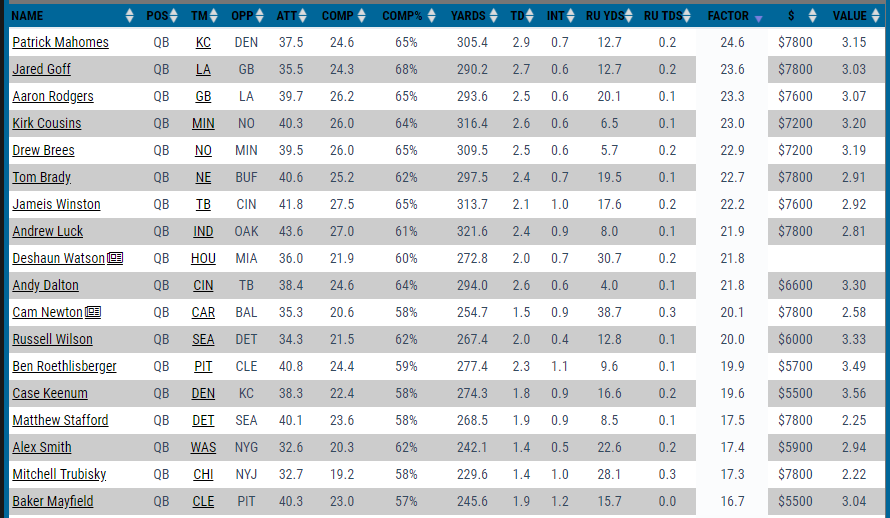You can see that the generator took the values we unearthed and was able to give us Todd Gurley and Saquon Barkley. Latavius Murray will be a game time decision as if Dalvin Cook plays we may have to pivot. Plenty of value to make great lineups on Fantasy Factor.