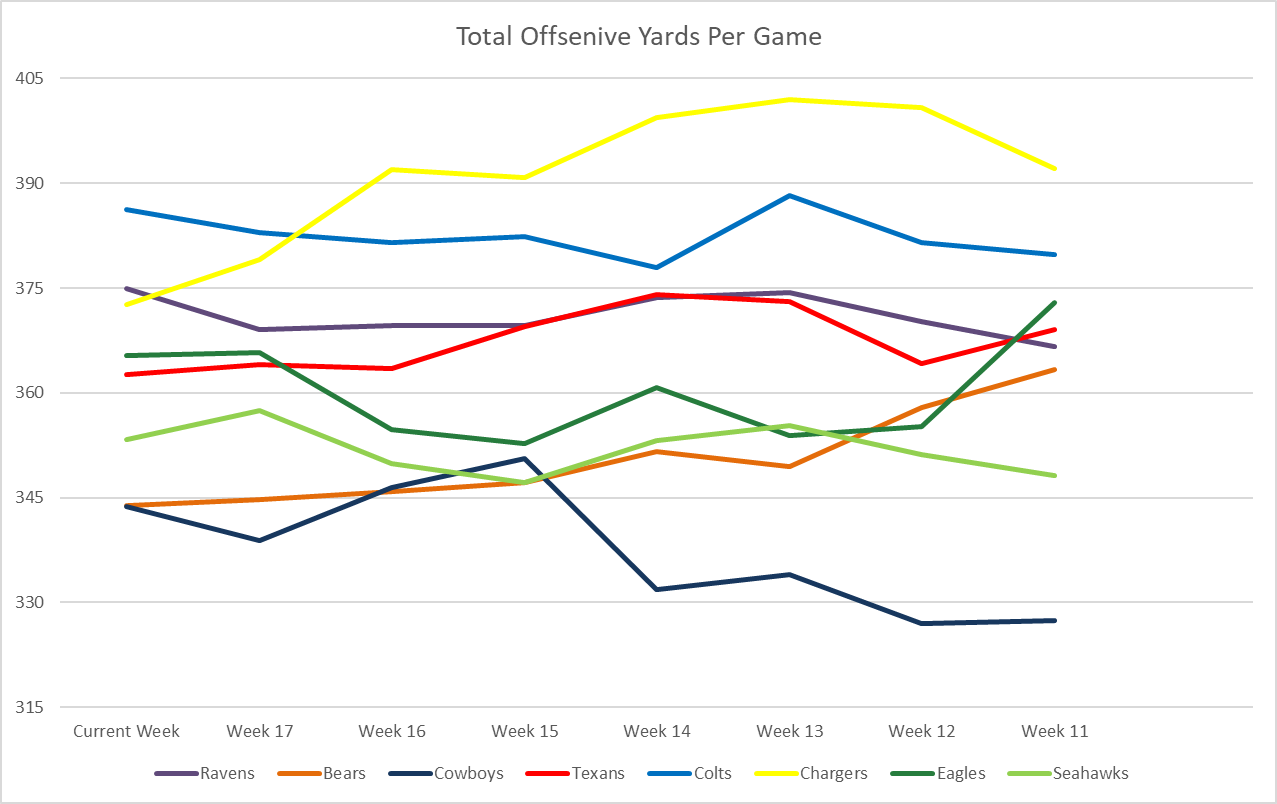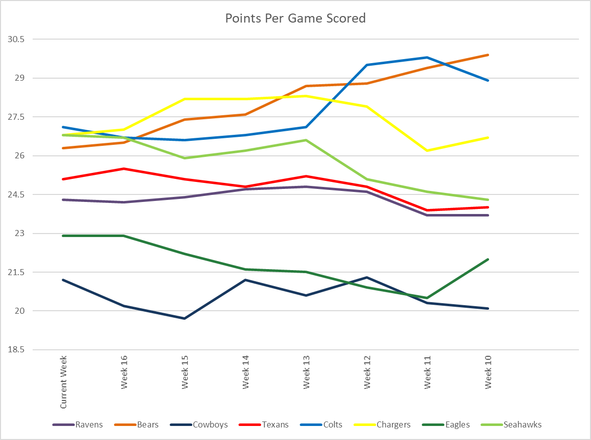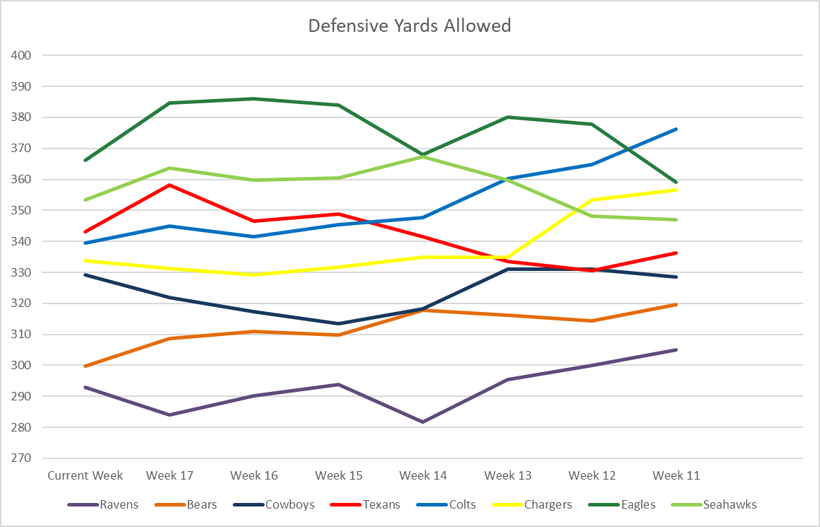 The following charts show the team's trends since Week 11 of the regular season in four key stats.