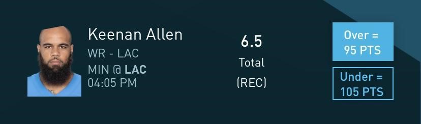 In Los Angeles’ last two games, Allen has a 35 percent target share and is averaging nine grabs per game. This line of 6.5 is a gift from ThriveFantasy. Take it and run! Allen caught 12 of 13 targets in his most recent game, and it seems like Mike Williams is playing a bit banged up, meaning more targets should funnel towards Allen. Take the over.