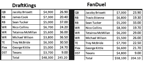 Like I said, that Cardinals stack worked like a dream, though using George Kittle over Christian McCaffrey as the component coming back was definitely the answer. CMC's price tag is always so constrictive, so you are typically forced into some DFS bargain picks you may not typically make. The more balanced approach was the way to go, as opposed to the stars & scrubs. I said last week that we were close and we inched along even further. Now let's get it for this week!