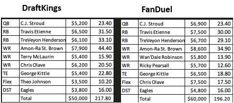 These scores would have taken down some serious cash in single-entry GPP and probably would have done reasonably well in some of the larger-field tournaments. The 2-TE set on DraftKings continues to work well and helps out with some of the budgetary restrictions. We didn't need to do it on FanDuel with the way their pricing is set up. We were able to us the same QB, RBs, TE and D/ST, but with the way the pricing was set for some for the receivers, we needed an extra pay-down over there. You can also see where we gained value in pricing mismatches. Terry McLaurin was a huge bargain on DK, but he was priced-up considerably over on FD. Same with Wan'Dale Robinson on FD. Because of the half-point PPR scoring, he was all the way down at $5,800 over there. The DFS Playbook has been a tried-and-true method of whittling down the player pool for you, While you may not have yet unlocked the true optimal lineup from the Playbook yet, I know a number of people have come pretty close and won some big money. That's our goal each and every week, so let's get to it!