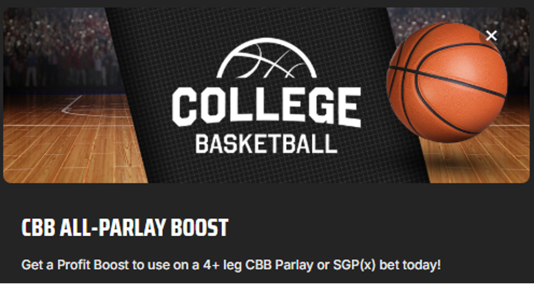 After opting in, you will receive one (1) single-use Profit Boost Token, which can be applied to a 4+ leg CBB Parlay, Same Game Parlay, or SGPx. Please note that the Profit Boost reward may differ.