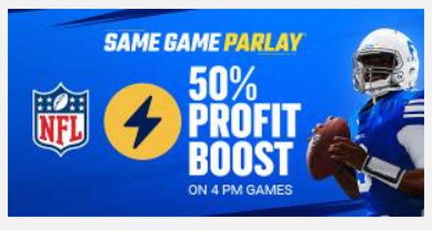 FanDuel Sportsbook keeps the excitement rolling with a Week 6 promotion for Same Game Parlays. You’ll receive two 50% Profit Boost Tokens, one for the 4 PM games and another for Sunday Night Football.Â