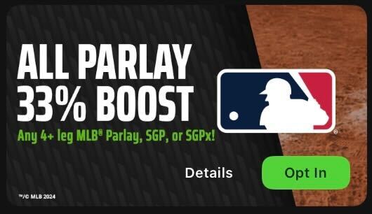 Place a 4+-leg parlay, Same Game Parlay or Same Game Parlay Plus bet on any MLB game on June 13th, 2024. Submit your entry and be sure to check the box in your bet slip to activate the 33% MLB parlay profit boost!