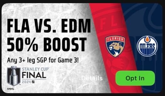 Use it for a 3+ Leg Same Game Parlay for the Panthers vs. Oilers Stanley Cup Final Game 3. Craft your SGP and remember to check the box in your bet slip to apply the 50% NHL SGP boost to your wager!