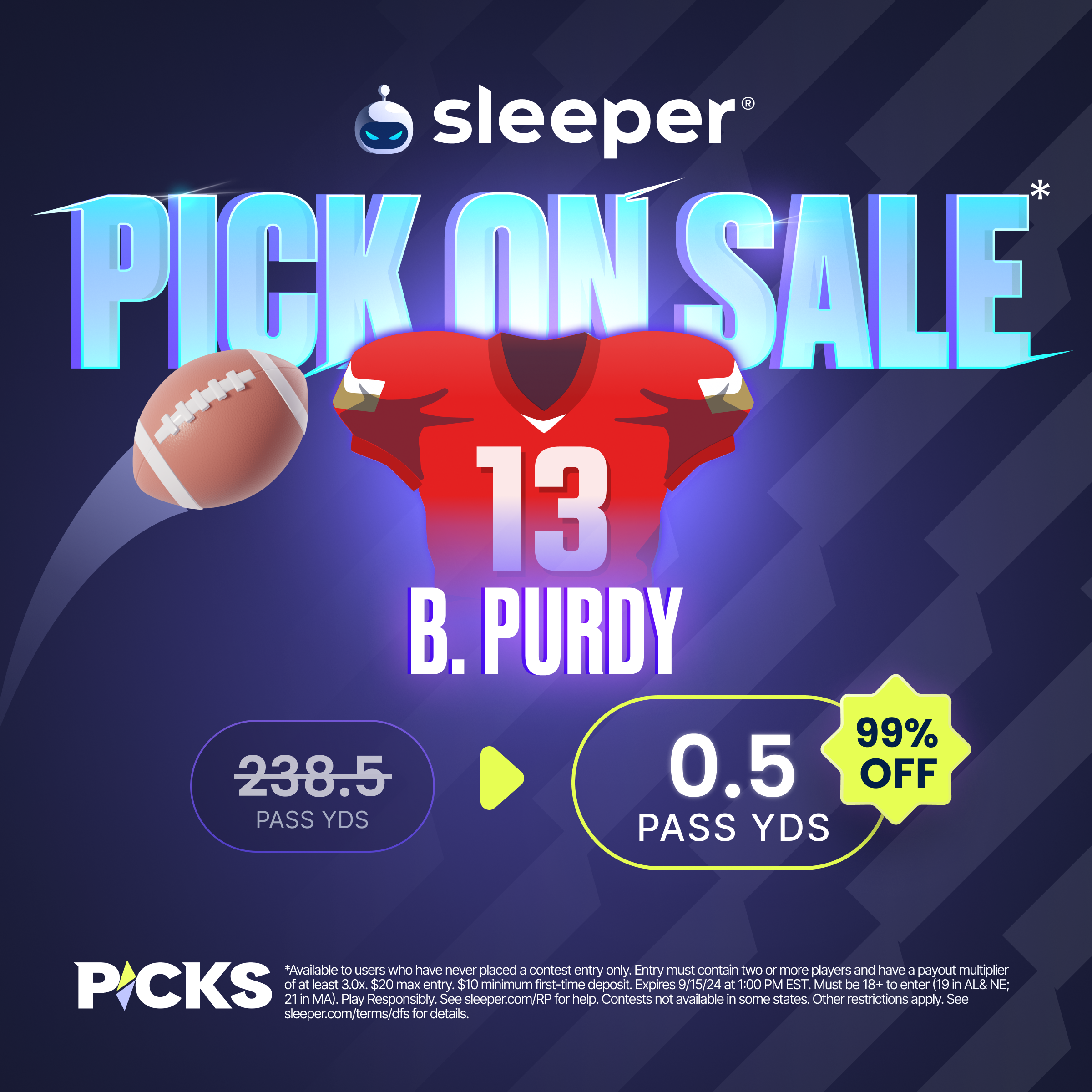 Now, let’s transition into your free NFL card after snagging your $100 Sleeper Fantasy promo code bonus. Purdy continues to be a topic of debate as to whether or not he is truly an elite QB, but with this discounted square, it’s not going to matter!