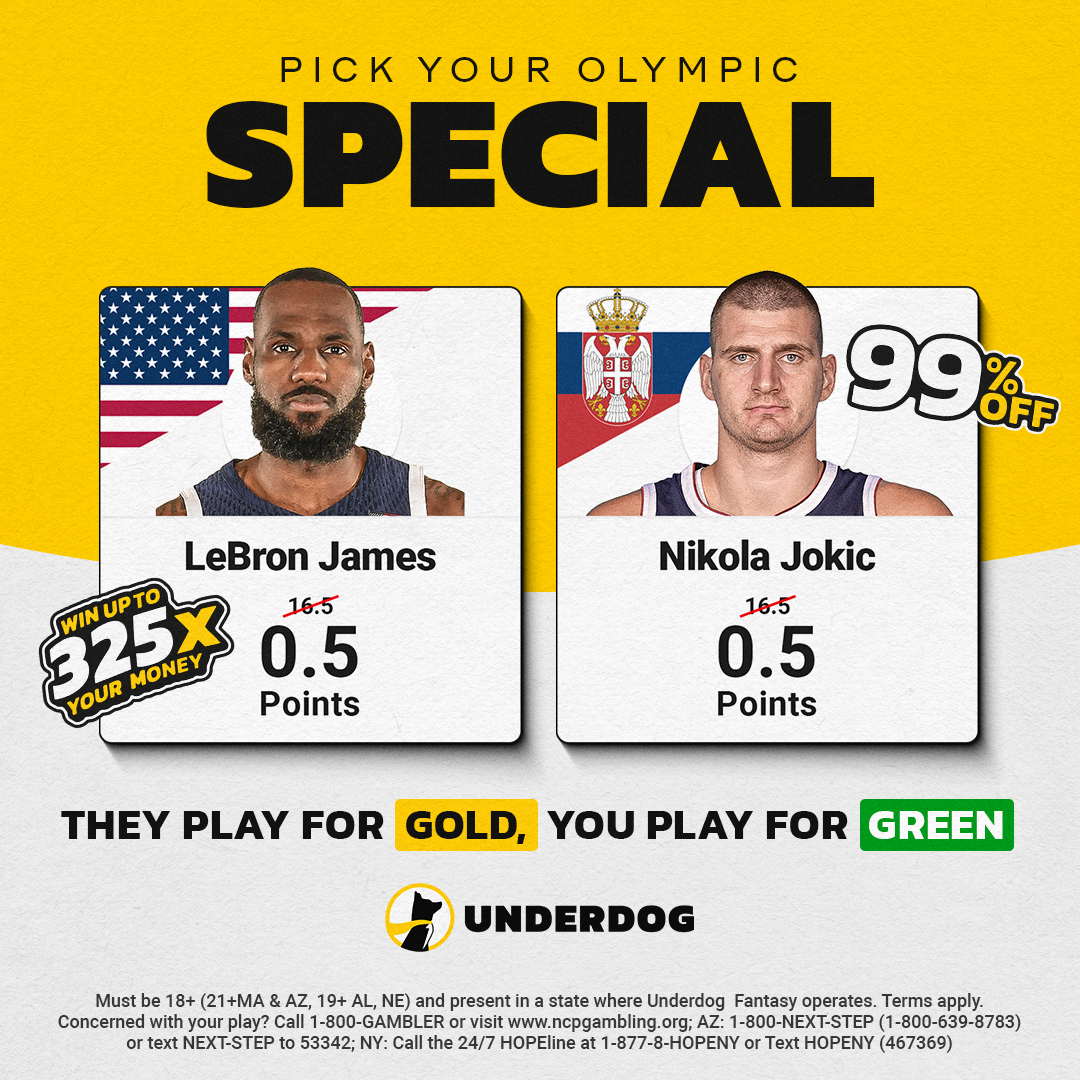 Celebrate the arrival of the 2024 Olympics at Underdog Fantasy with a 99% discount on LeBron James or Nikola Jokic, $250 deposit bonus and more! Click here to instantly claim them now using Underdog Fantasy promo code: ALARM.