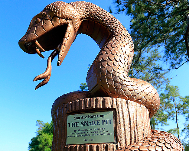 The last thing to mention is “The Snake Pit.” These players will finish their rounds every day in what is affectionately known as “The Snake Pit” which is holes 16 thru 18. It starts with a 460 yard Par 4 with water all along the right side and a tight tree line along the left with a green that just repels golf balls. Then you move to a 215 yard Par 3 with a narrow opening to a long green and you finish things off with a 445 yard Par 4 which has a green that is tucked away to the left which makes it extremely difficult for these players to make the green in two. All of the greens on Copperhead are a challenge to reach safely but these last three can really bite you which is why it is known as “The Snake Pit.”